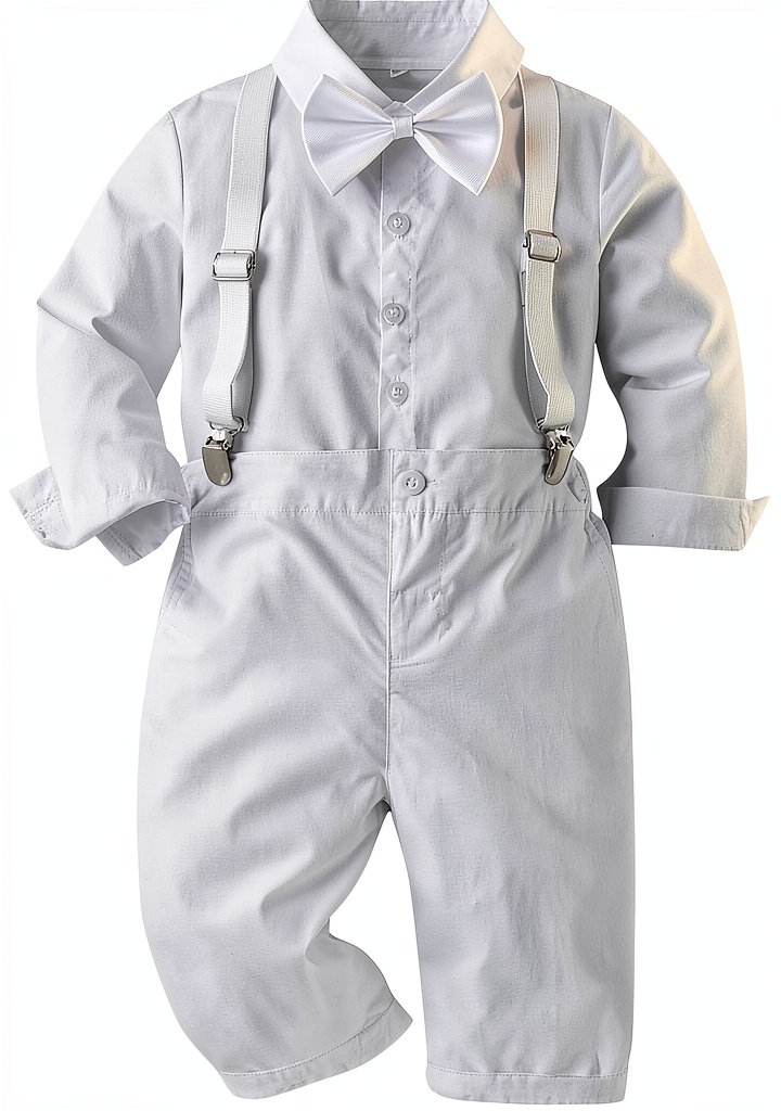 This elegant baby boy christening suit features a classic bowtie shirt and adjustable suspenders pants, designed for special occasions like first Christmas, Easter, and baptisms. The comfortable, stylish set is ideal for photo shoots and parties, available in various sizes and colors to suit your little gentleman. Crafted for practicality and lasting memories.